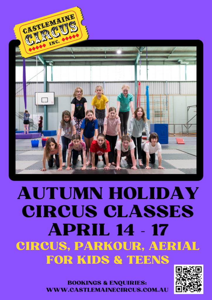 Parkour Masterclass Wed 3 Apr 9.00-12.00pm: 12+ year olds (experienced only) https://events.humanitix.com/autumn-holiday-parkour-masterclass Parkour Fun Thurs 4 April 9.00-11.00am: 5-8 year olds 11.10-1.10pm: 9-12 year olds https://events.humanitix.com/parkour-fun-autumn Circus Fun Wed 10 & Thurs 11 Apr 9.00-12.00pm: 6-12 year olds https://events.humanitix.com/autumn-holiday-circus-classes Aerial Adults Wed 3 & Thurs 4 Apr 7.00-9.00pm https://events.humanitix.com/autumn-holiday-adults-aerials All enquiries, contact Bek on info@castlemainecircus.com.au […]